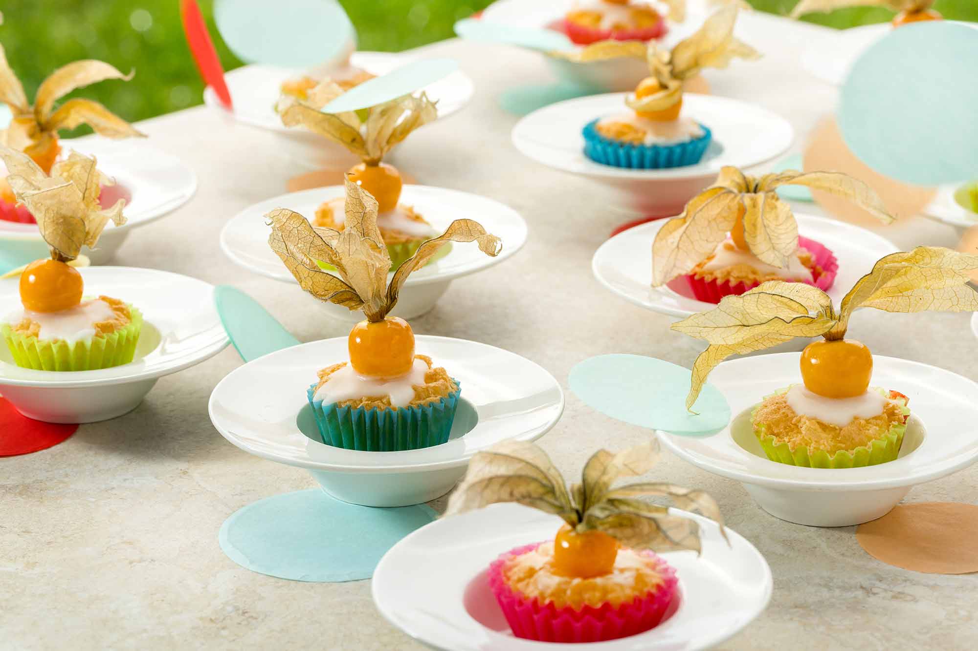 Von 200 g Physalis 12 Stück zur Verzierung beiseite legen. Von den restlichen Physalis die Blätter entfernen. 2 Eier mit 120 g Puderzucker und 1 Tl abgeriebener Bio-Limettenschale 4-5 Min. weiß-schaumig rühren. 75 g flüssige abgekühlte Butter und 75 ml frisch gepressten Orangensaft unterrühren. 50 g Mehl, 1 Pk. Vanillepuddingpulver und 1 Tl Backpulver mischen und kurz unterrühren. Teig in ein mit Papierförmchen ausgelegtes Muffinblech verteilen. Physalis darauf verteilen. Im heißen Ofen bei 180 Grad (Umluft 160 Grad) auf der mittleren Schiene ca. 22-25 Min. backen. Abkühlen lassen. 75 g Puderzucker mit 2 El Limettensaft verrühren. Muffins mit Zuckerguss und restlichen Physalis verzieren.